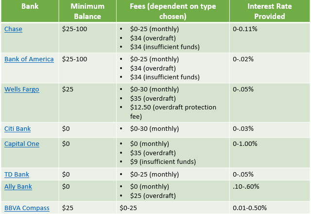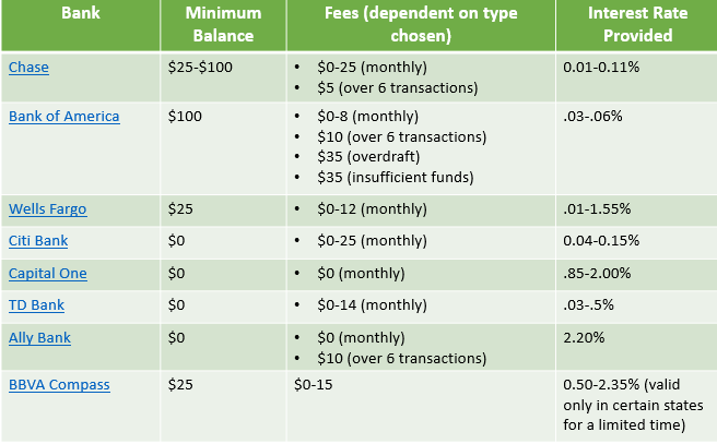 That being said, I don't expect you to just take my word for it. Actually, I would not be happy with you if you did. You are supposed to be in control of your finances, and that means doing the research to figure out which bank is best for you. To help with this, I created two charts, one on checking accounts and the other on savings accounts, comparing big-name banks. This is, of course, not an exhaustive list.
